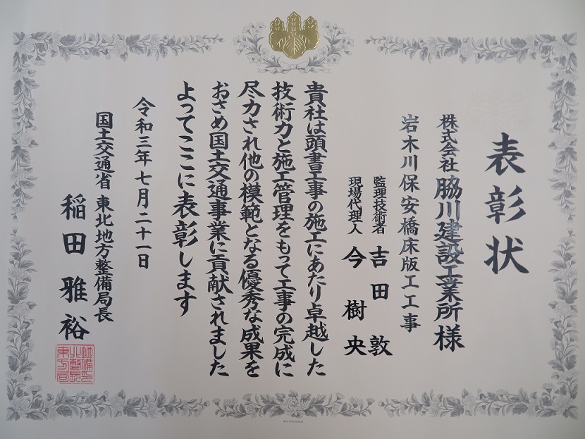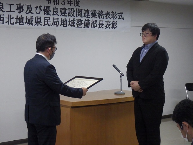 - 西北地域県民局地域整備部優良工事表彰(土木工事部門)を受けました。