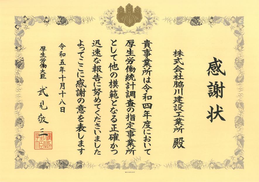 - 厚生労働統計調査の指定事業所として感謝状を受けました。